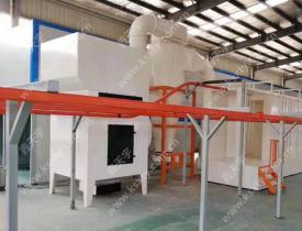 因?yàn)楸粐姽ぜ^為復(fù)雜,為方便手噴,特采用世界先進(jìn)的進(jìn)出口平臺(tái)外手噴形式。能便于手噴人員零距離靠近工件觀察和噴涂工件的難噴角位,手噴操作位置環(huán)境亦更加舒適。噴房手噴口外置后,噴房?jī)?nèi)長(zhǎng)縮短,更易于清理。同時(shí)考慮到工件的多樣性,特設(shè)計(jì)粉房底部及頂部各加一把固定槍。