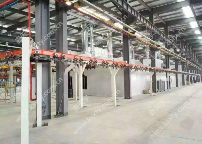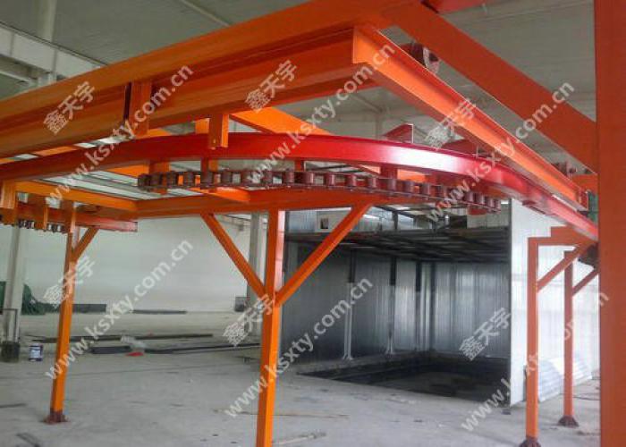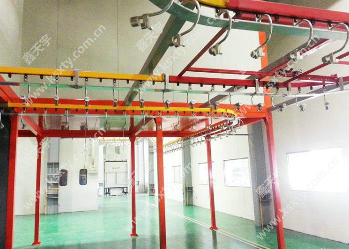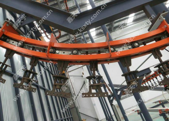 由一條萬向輸送鏈帶動鋁型材以指定的路軌移動, 整條線鏈條長度在 100~150 米,可耐高溫。其運行速度與噴槍數量和噴粉厚度有關, 一般情況下單面十二支噴槍的話輸送鏈運行速度在1.5 ~2m/min。